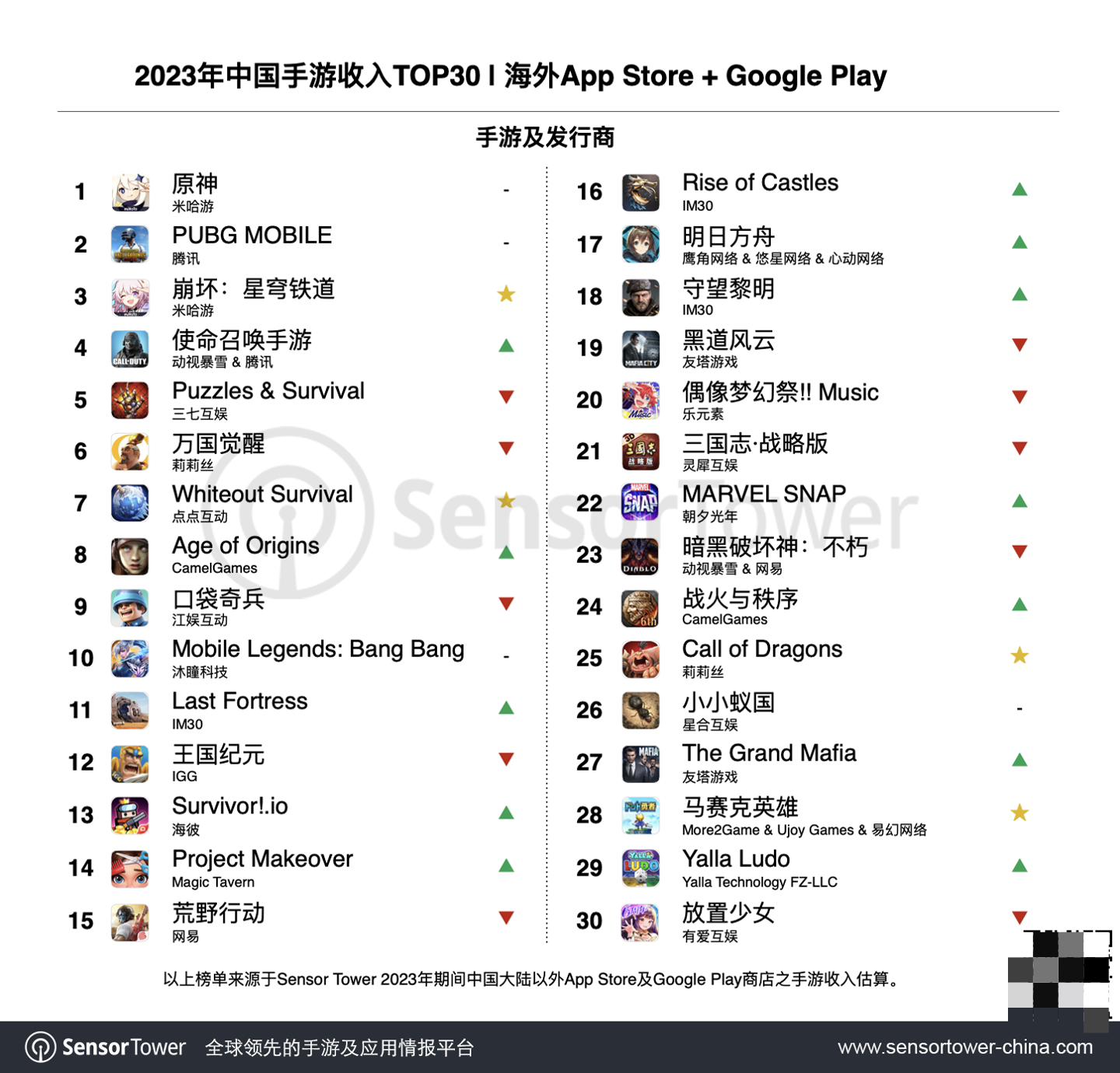 值得一提的是,此前SensorTower发布的2023中国手游出海年度盘点,关于游戏收入方面,米哈游旗下《原神》《崩坏:星穹铁道》分别位列第一、第三,其中 4 月上线的《崩坏:星穹铁道》成为 2023 年收入增长最高的出海手游。