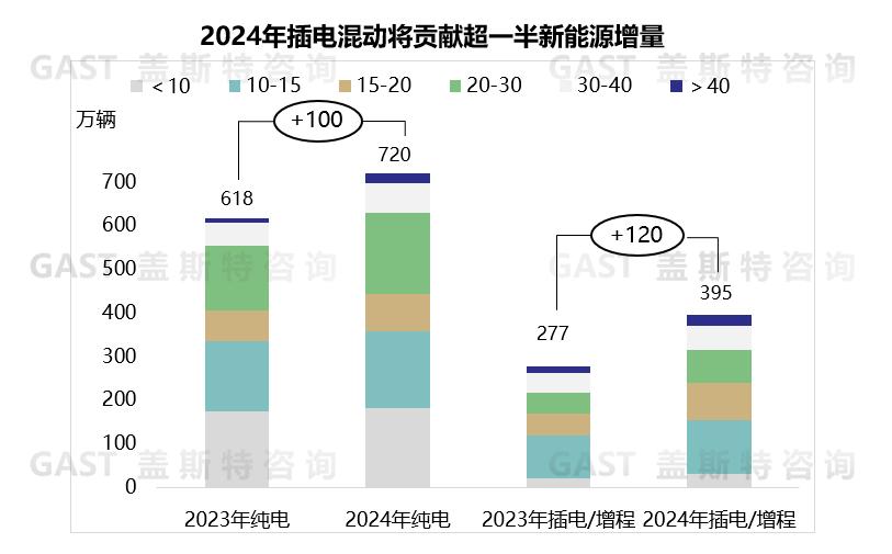 盖斯特判断:2024年插混车型预计可净增120万辆,在新能源乘用车市场的占比有望突破35%,且增速超过新能源乘用车市场的整体水平。具体来看,插混车型在不同价格区间将有不同的增量表现:在10万以下的价格区间,由于更多插混车型价格下探,有望带来10万辆的增量;10万-20万价格区间将是插混车型最大的增量区间,预计增量可达60万辆,特别是中国品牌的插混产品将加速抢占合资品牌燃油车产品的市场份额;20万-30万元属于纯电车型的核心价格区间,但是插混车型在此区间的销量也有望提升,预计会有30万辆的增量;而在30万以上的价格区间,硬派越野车型和具有大空间特色的增程SUV将是增量的主要贡献者,预计可增加20万辆。