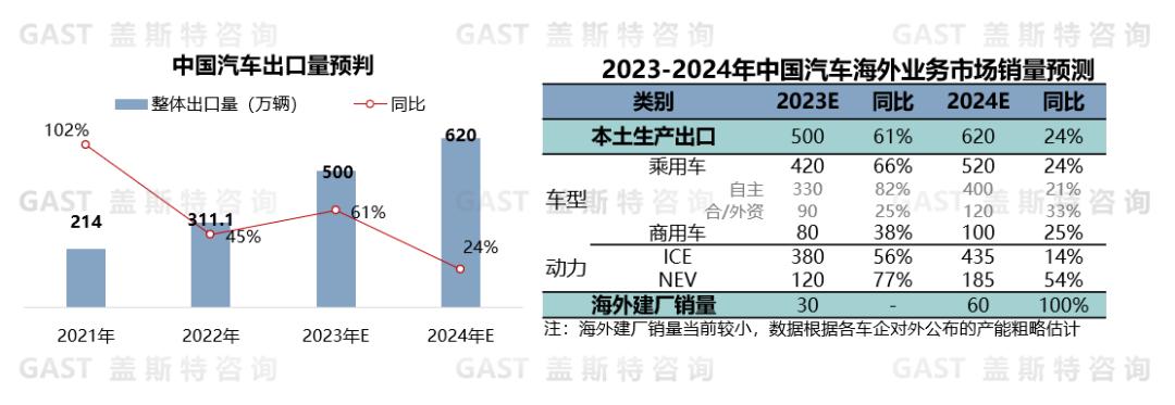 盖斯特判断:2024年中国汽车贸易型出口总量预计可达620万辆,保持世界第一大汽车出口国的地位。其中在品牌分类上,中国品牌车企的出口将保持增长态势,总量预计增加70万辆;合资品牌车企由于在中国市场面临销量下滑和产能过剩,将积极转向海外市场,出口总量预计增加30万辆。在动力型式分类上,新能源汽车出口量预计可达185万辆,同比增长约54%;传统燃油汽车出口量预计在435万辆左右,同比增长约14%。同时我们判断,2024年中国车企出海模式将有较大改变。出于规避贸易壁垒、加强成本控制和提升市场反应速度等多种因素综合考虑,中国车企将继续扩大在海外市场的本土化布局,并采取与国内企业抱团出海、海外收购、与外资品牌合作等方式来加快海外布局。