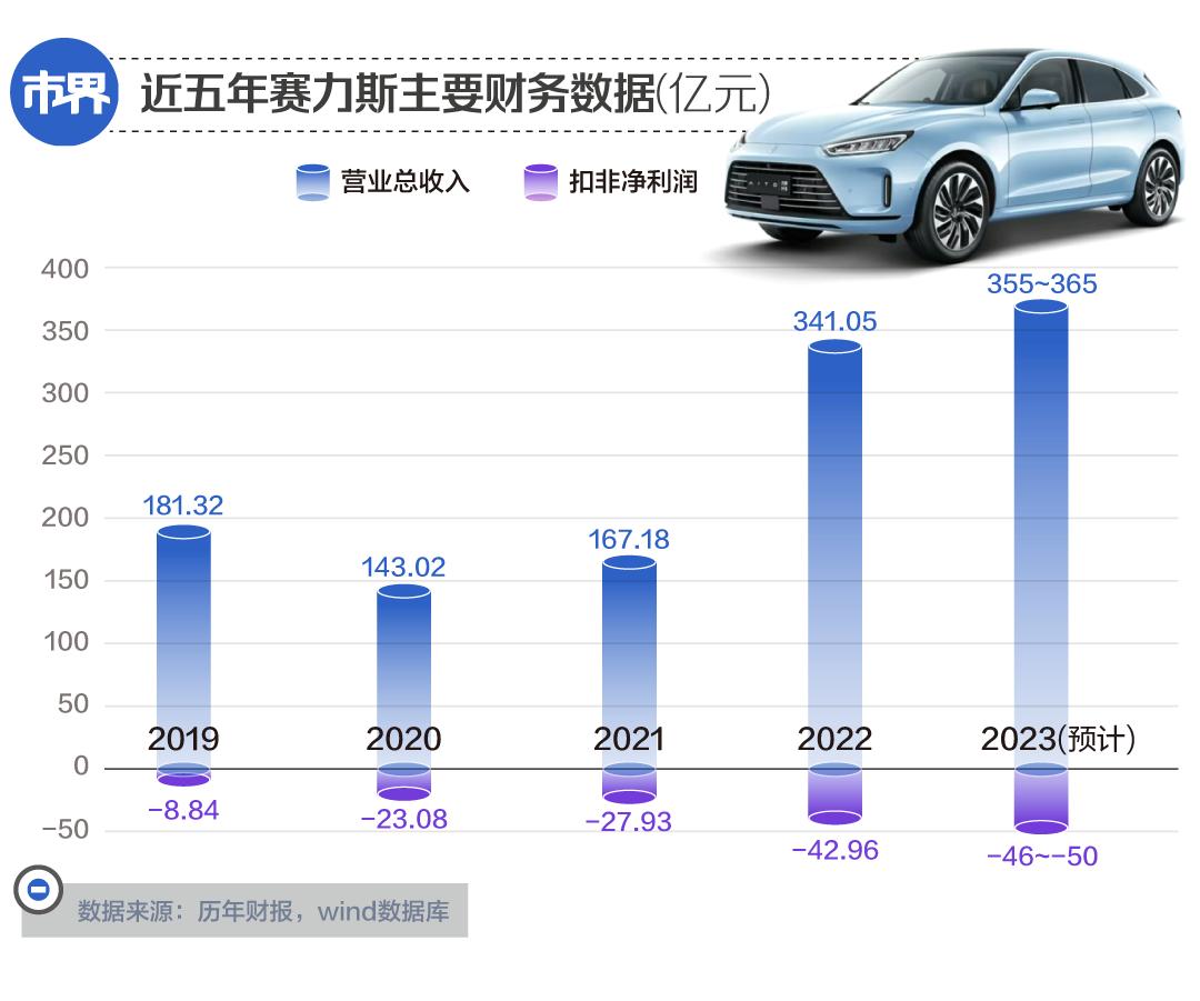 1月24日晚,华为智选车业务深度合作伙伴赛力斯汽车公布2023年业绩预告:营业收入预计实现355亿元到365亿元,同比增长4.09%到7.02%;净利润亏损21亿元~27亿元,扣非净利润亏损46亿元~50亿元。