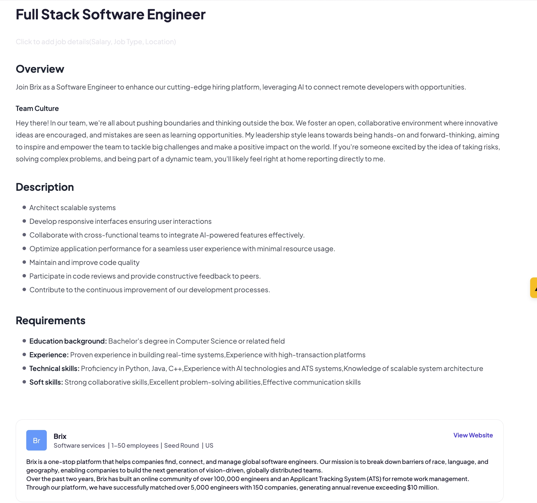 Brix于2020年12月在美国创立,致力于通过智能化的AI跨境招聘平台,为美国企业提供一站式远程跨境雇佣解决方案。