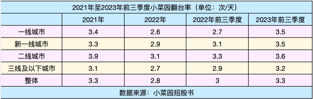 而在二线和三线及以下城市,小菜园的翻台率在2023年前三季度分别达到3.6和3.2,表现明显优于同期一线和新一线城市。