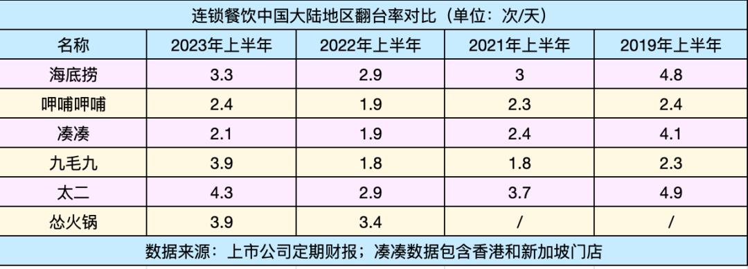 海底捞的翻台率则从2.9回升至3.3,好于2021年上半年水平,但不及2019年同期的4.8次。