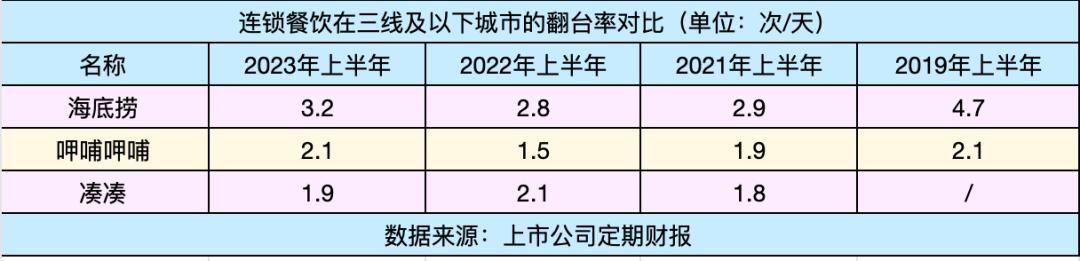 横向对比发现,仅有主打平价小火锅的呷哺呷哺在下沉市场的翻台率恢复到了2019年同期水平。