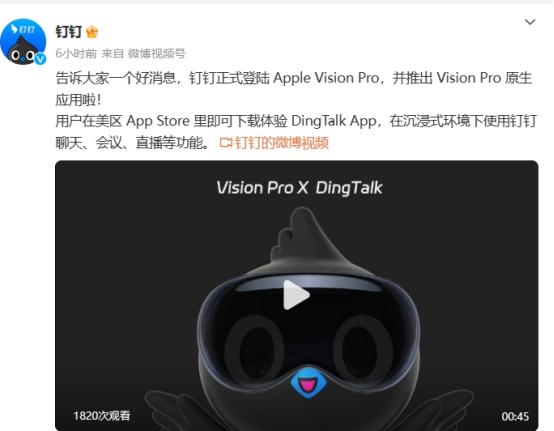 其中钉钉也为苹果 Vision Pro 头显推出原生应用,用户在美区应用商店里可下载体验 XR 版本的 DingTalk 。