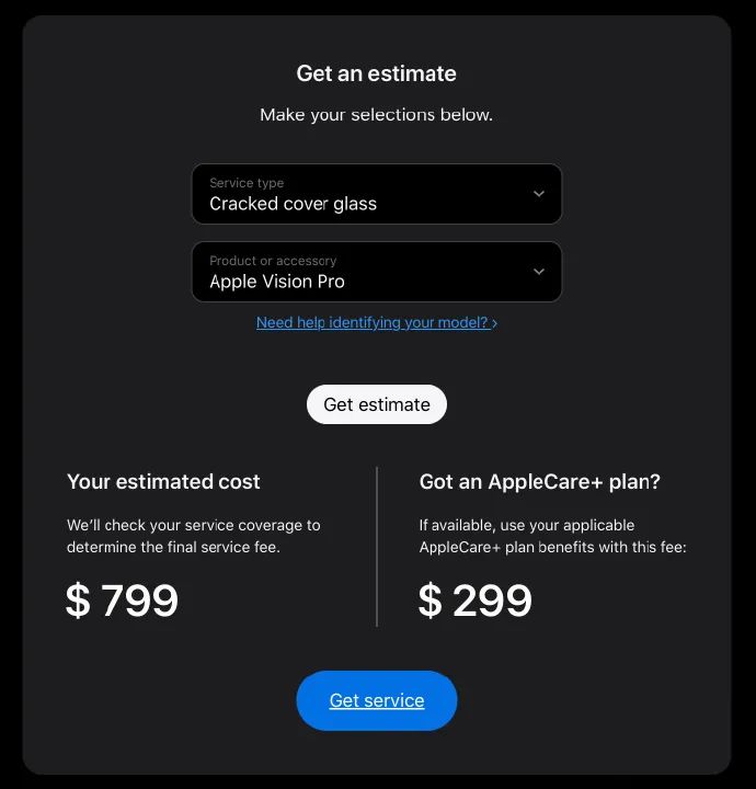价格方面,更换一块全新的玻璃镜片需要 799 美元(约 5747 元人民币),若用户购买了 AppleCare+,则需要 299 美元(约 2151 元人民币)。