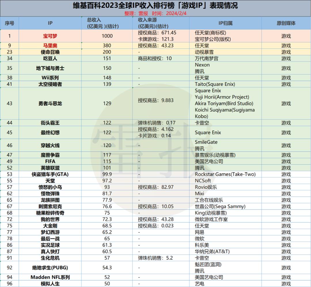 相比之下,根据近期维基百科公布的“2023全球IP收入排行”数据,海外顶级游戏IP如“宝可梦”“马里奥”等,其授权商品的收入在IP的整体营收中占到了相当可观的比重。