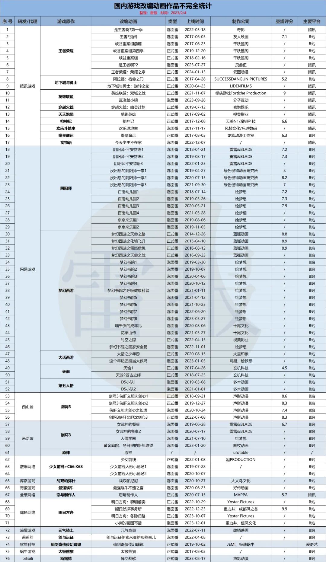 对此,雷报详细统计了国内游戏76部改编动画作品情况。具体表格如下:
