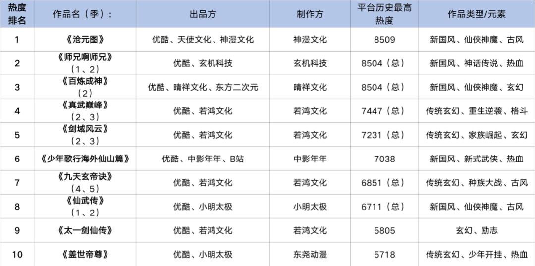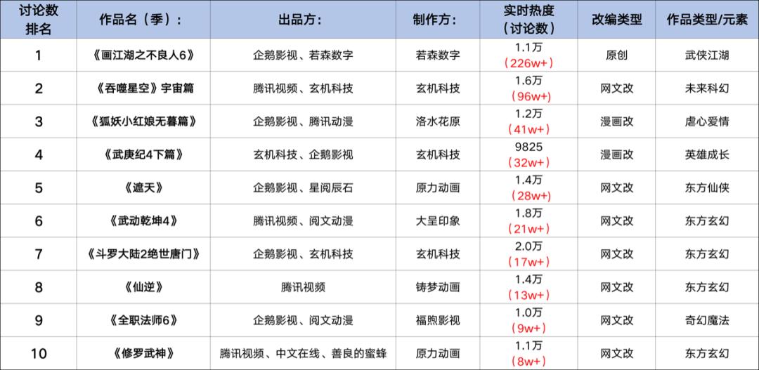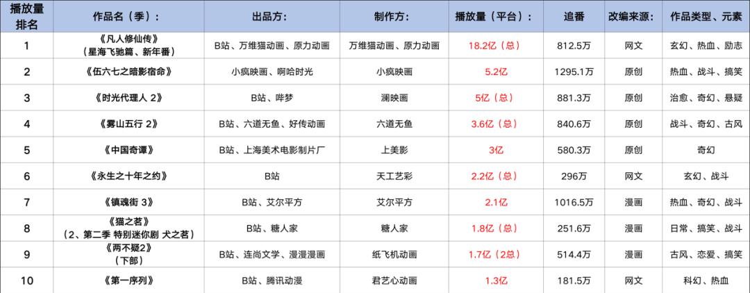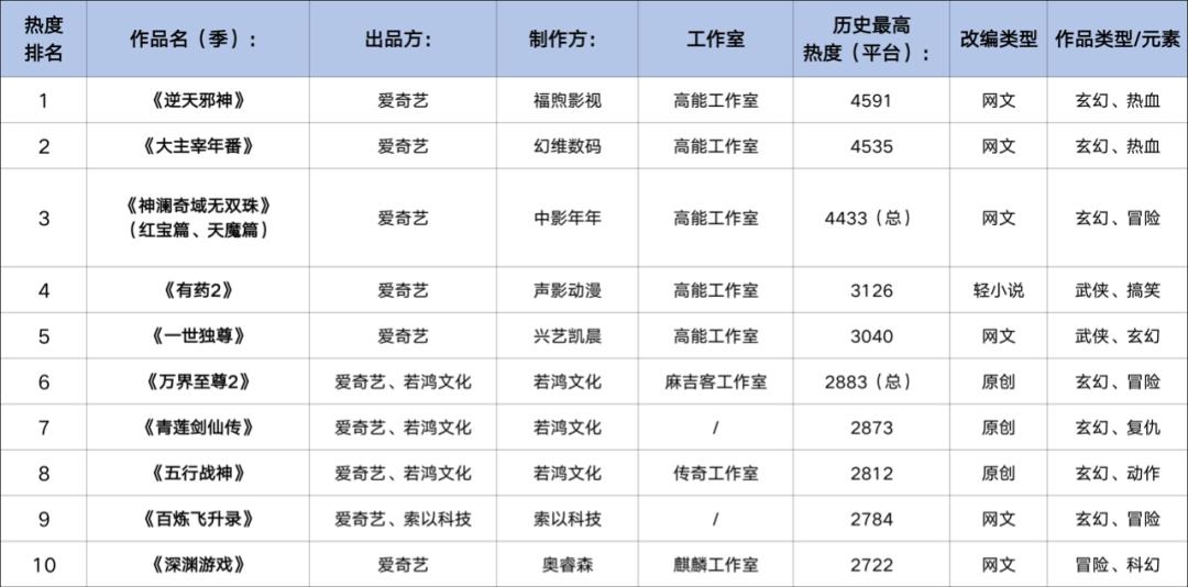 从动画作品的播出效果上看,综合腾讯视频、爱奇艺、优酷、B站四大平台,最近两个年度的当年热度TOP10中均由小说改和漫改作品主导,而未出现游戏改编动画的身影。