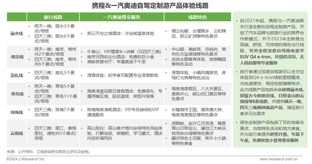通过绿色出行线路产品的合作,携程集团与一汽奥迪在加强品牌车型认知和好感度的同时,为旅行者提供更个性化和特色化的旅行体验,这种合作模式凸显了双方在旅游资源整合、营销推广以及新能源汽车产品等方面的核心竞争力。携程与一汽奥迪共同打造的“车旅融合”模式实现了优势互补和产品创新,为旅行者带来了绿色出行的全新体验。未来,新兴融合发展模式的探索将成为旅游高质量发展的重要趋势。