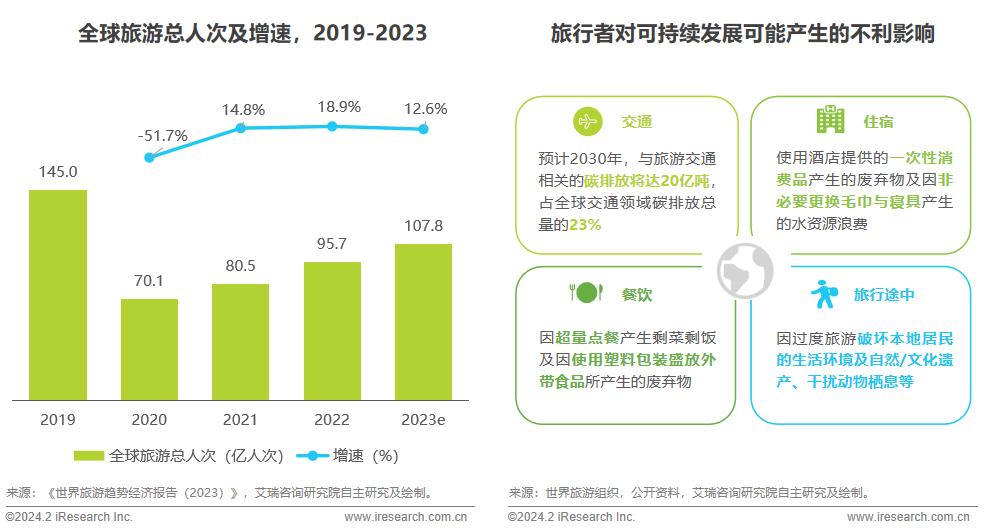 2023年全球旅游总人次预计达107.8亿,恢复至疫情前2019年的74.3%,全球旅游业正呈现稳步复苏态势。然而,在旅游业回暖的过程中,因旅游交通所产生的碳排放、一次性酒店用品所产生的废弃物、超量点餐所产生的剩饭剩菜及因过度旅游导致的环境破坏等问题正不断挑战全球可持续发展。为遏制气候变暖等消极信号不断释放,旅游业需积极践行可持续理念,为推动全球可持续发展付诸行动。