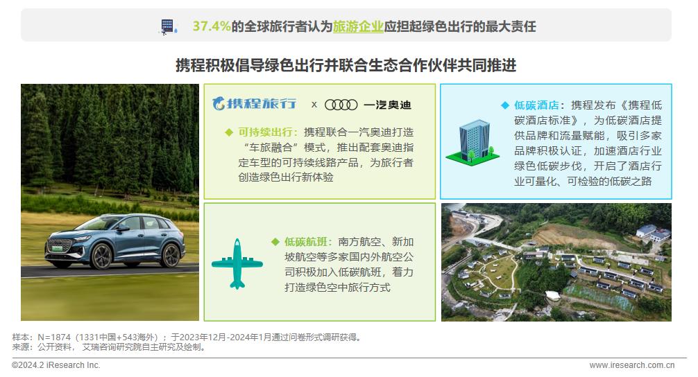 37.4%的全球旅行者认为旅游企业应担起绿色出行的最大责任。携程持续创新ESG可持续发展战略,积极倡导绿色出行:在行业标准方面,携程通过发布低碳酒店标准、推行低碳航班等方式联合众多生态合作伙伴,带动行业低碳实践;在产品创新方面,携程与一汽奥迪跨界联合,打造符合绿色出行理念的可持续线路产品。在低碳经济背景下,各方旅游企业主体正加速履行社会责任,合力推动绿色出行发展。