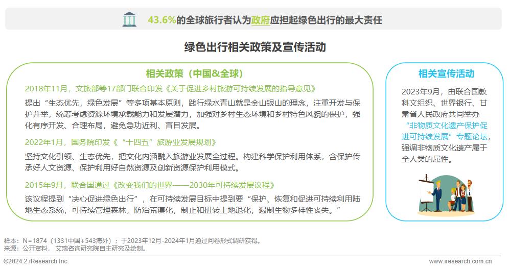 43.6%的全球旅行者认为政府应在推动绿色出行方面承担最大责任,2015年,联合国通过全球193个会员国达成的《改变我们的世界——2030年可持续发展议程》,绿色出行理念深受全球各国政府重视。2022年,中国政府在《“十四五”旅游业发展规划》中倡导构建科学保护利用体系,坚持文化引领与生态优先。除政策支持外,相关政府机构积极举办文化遗产保护等专题论坛,进一步向公众宣传绿色出行理念。