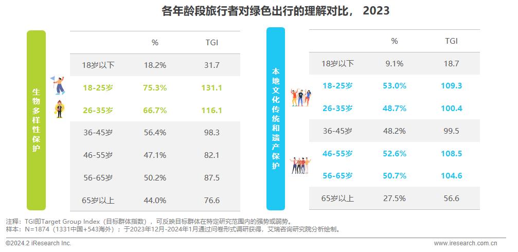 18-35岁的旅行者更看重生物多样性保护,年轻人和中老年群体更重视本地文化传统和遗产保护