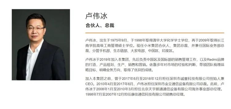 据小米集团官网披露的简历,卢伟冰于2019年加入小米集团,先后负责中国区及国际部的销售管理工作,以及Redmi品牌的打造,产品规划、生产、销售和营销。