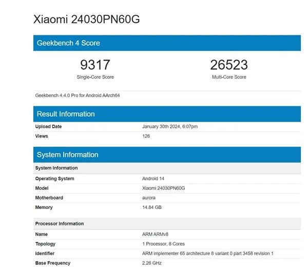 在性能方面,此前小米14 Ultra已经现身Geekbench跑分网站,机型编号为24030PN60G,代号“aurora”。