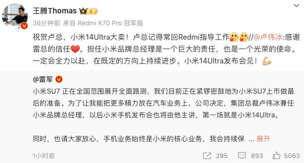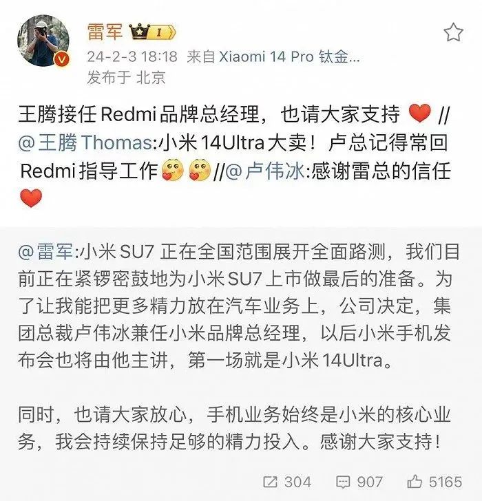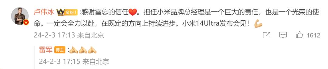 首先,在雷军公布消息之后,卢伟冰很快便表态了,转发雷军的微博并配文,“感谢雷总的信任。担任小米品牌总经理是一个巨大的责任,也是一个光荣的使命。一定会全力以赴,在既定的方向上持续进步。小米14Ultra发布会见!”