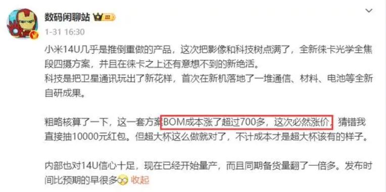 业内人士分析,上卫星通信,成本就得加300。因此该博主表示,小米14 Ultra的BOM成本涨了700+,因此这次必然涨价,不会再是5999元起了。从成本上涨分析,小米14 Ultra的起售价应该介于6499元到6999元之间。