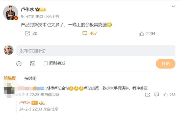 在上任消息公布后,大家对下一款新机小米14 Ultra也变得越发好奇,对此卢伟冰在微博上感叹道:“产品的新技术点太多了,一晚上的会极其烧脑”。