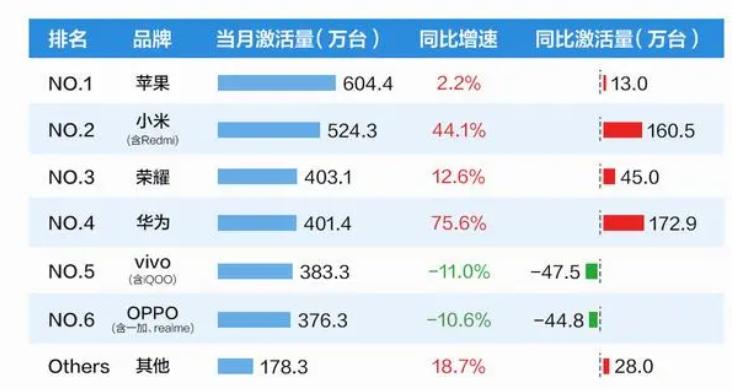 目前据BCI数据,2023年11月,在中国市场小米(含Redmi)新机激活量524.3万台,同比增长160.5万台,同比增速为44.1%,凭18.3%的市场份额跃升至国内品牌第一,仅次于海外品牌苹果。