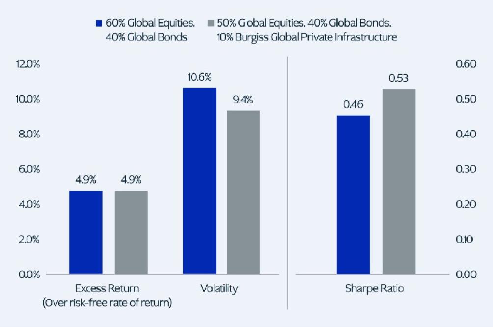 布兰登·弗里曼引用历史数据显示,私人基础设施投资的波动性低于大多数其他资产类别,同时也产生了有吸引力的回报。在传统的“60/40投资组合”中,60%资金被配置为股权,40%资金配置债券。布兰登·弗里曼发现,如果将这一组合调整为50%股权、40%债券、10%私人基础设施投资,那么超额收益率几乎没有变化,波动性却可以大大下降。
