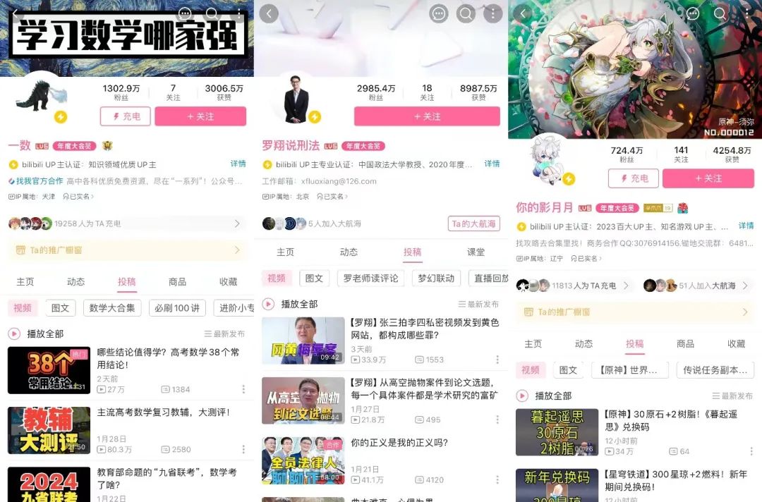 年涨粉数量排在第二和第三的UP主分别是“一数”和“罗翔说刑法”,前者是教数学的高中老师,一年涨了526.8万;后者是凭普法出圈的“张三克星”,一年涨了410.3万。