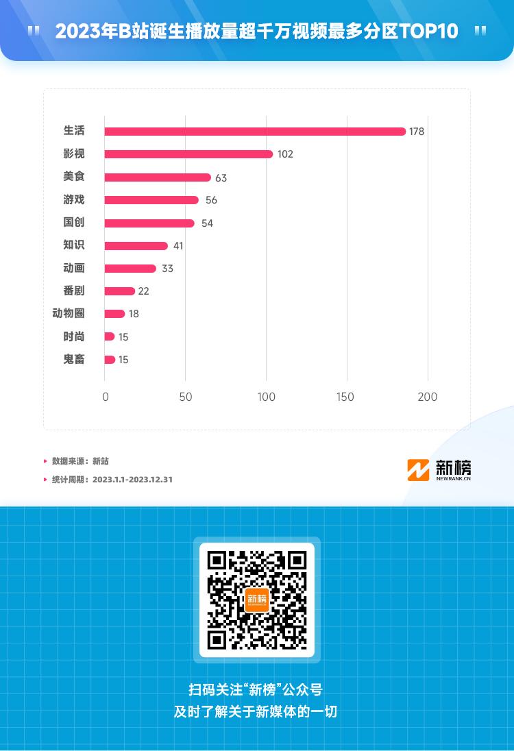 据新站数据不完全统计,2023年发布的B站视频中,有530条播放量破千万。从视频分区来看,生活区遥遥领先,全年有178条视频播放量破千万。