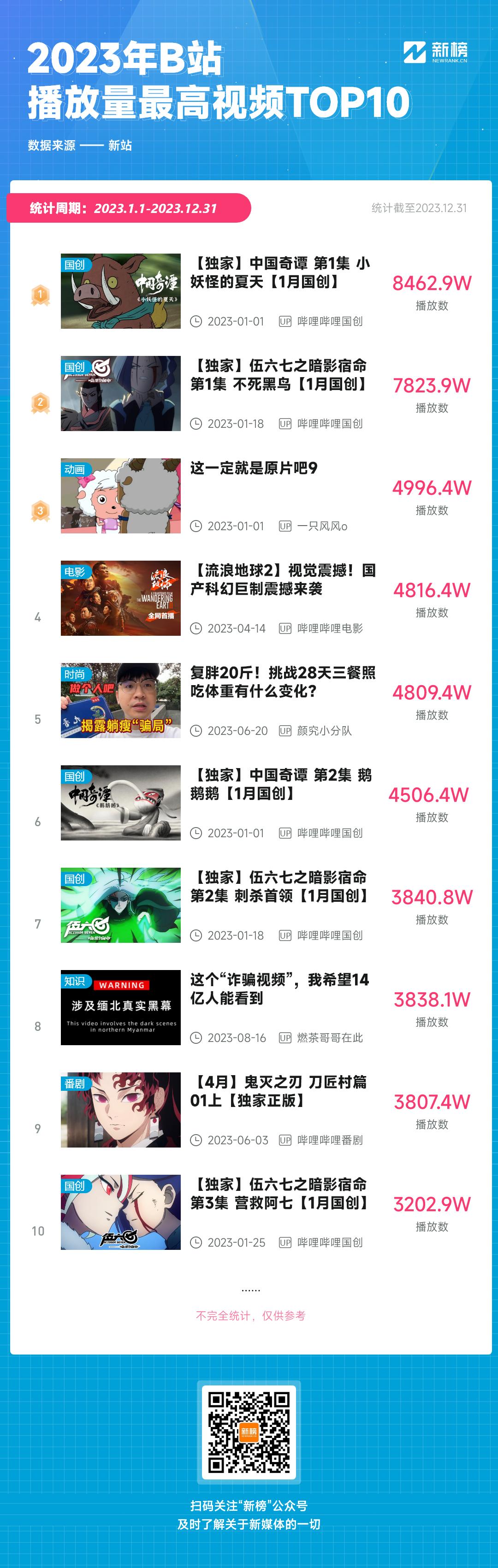 《中国奇谭》一夜爆红,全季播放量超过3亿,国创热度再次被推上新高;知识科普、影视杂谈、传统文化、鬼畜搞笑等多领域在2023年累计产出了超过530条千万播放量的原创视频。