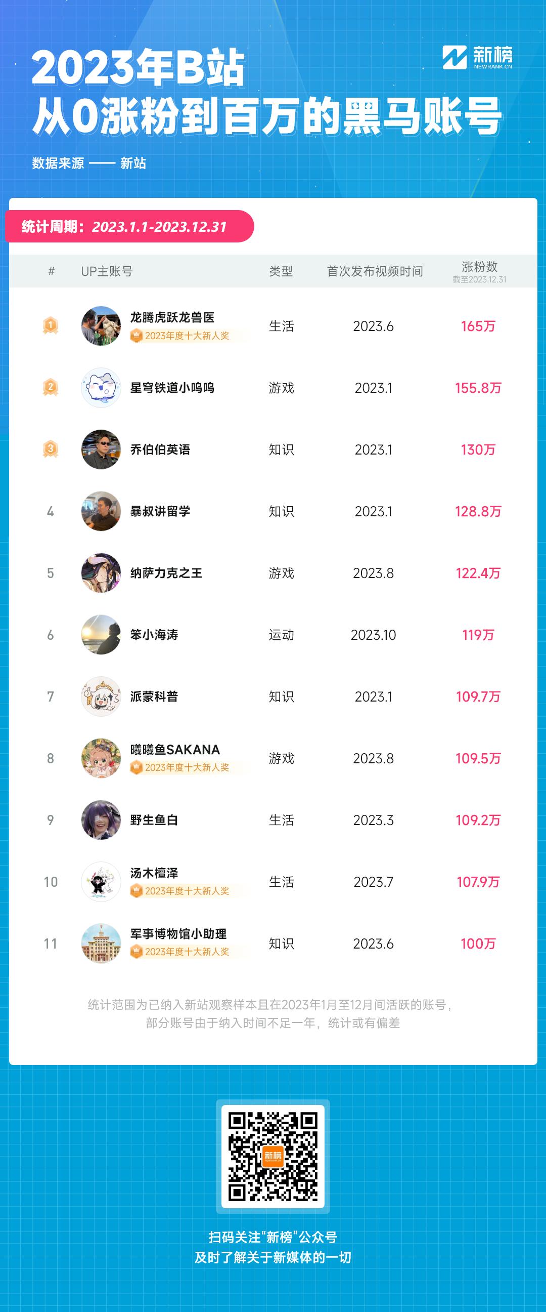 据新站数据不完全统计,过去一年至少有11个B站账号从0涨粉至百万以上。