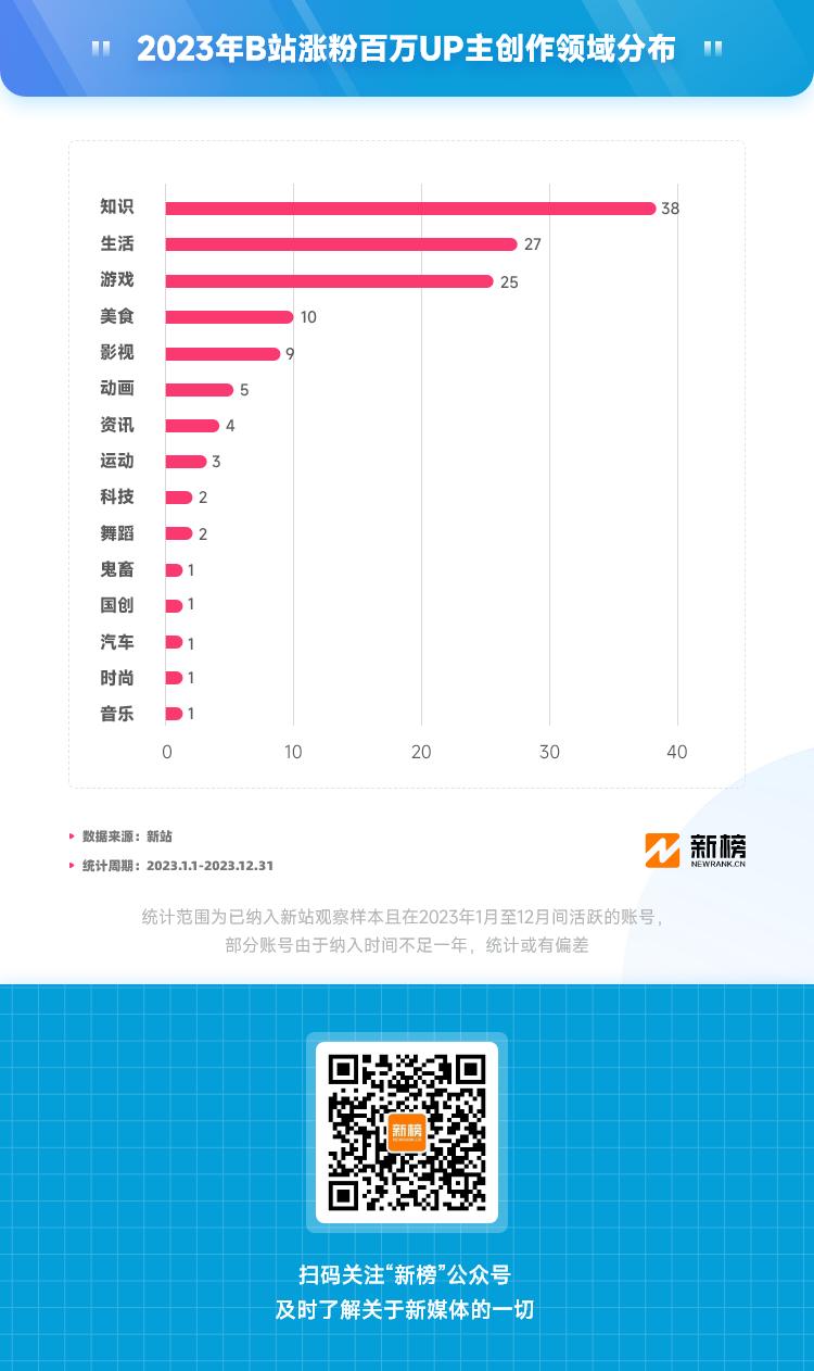 如往年一样,这些在过去一年涨粉超百万的UP主们,大多来自知识、生活、游戏三个分区。知识区继续领先,至少有38位UP主在2023年涨粉超百万,生活区紧随其后有27位,游戏区有25位。