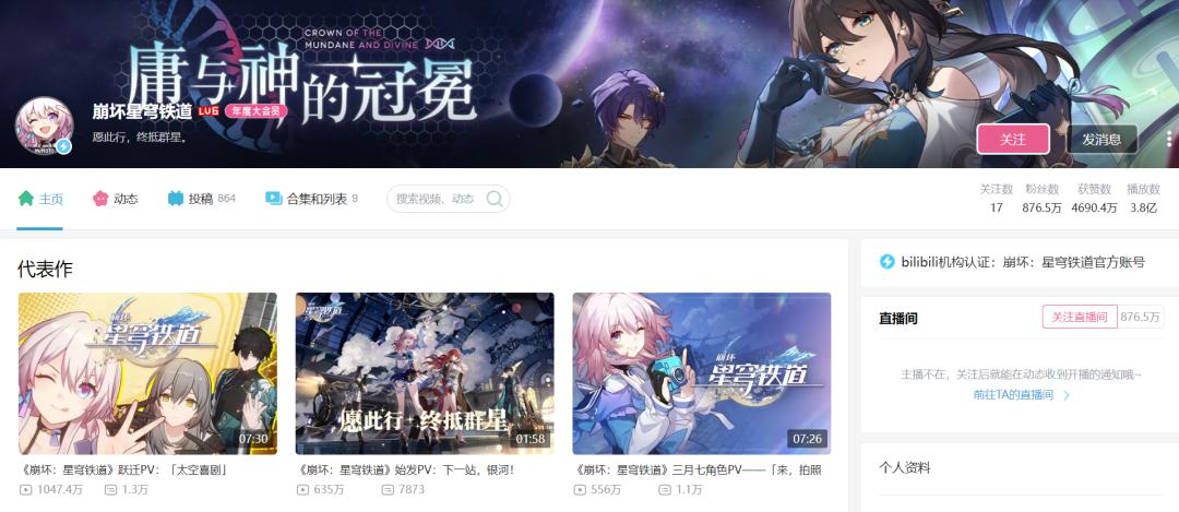 这其中,涨粉最多的是游戏账号“崩坏星穹铁道”,一年涨粉近630万,截至目前该账号在B站的粉丝数为871万。