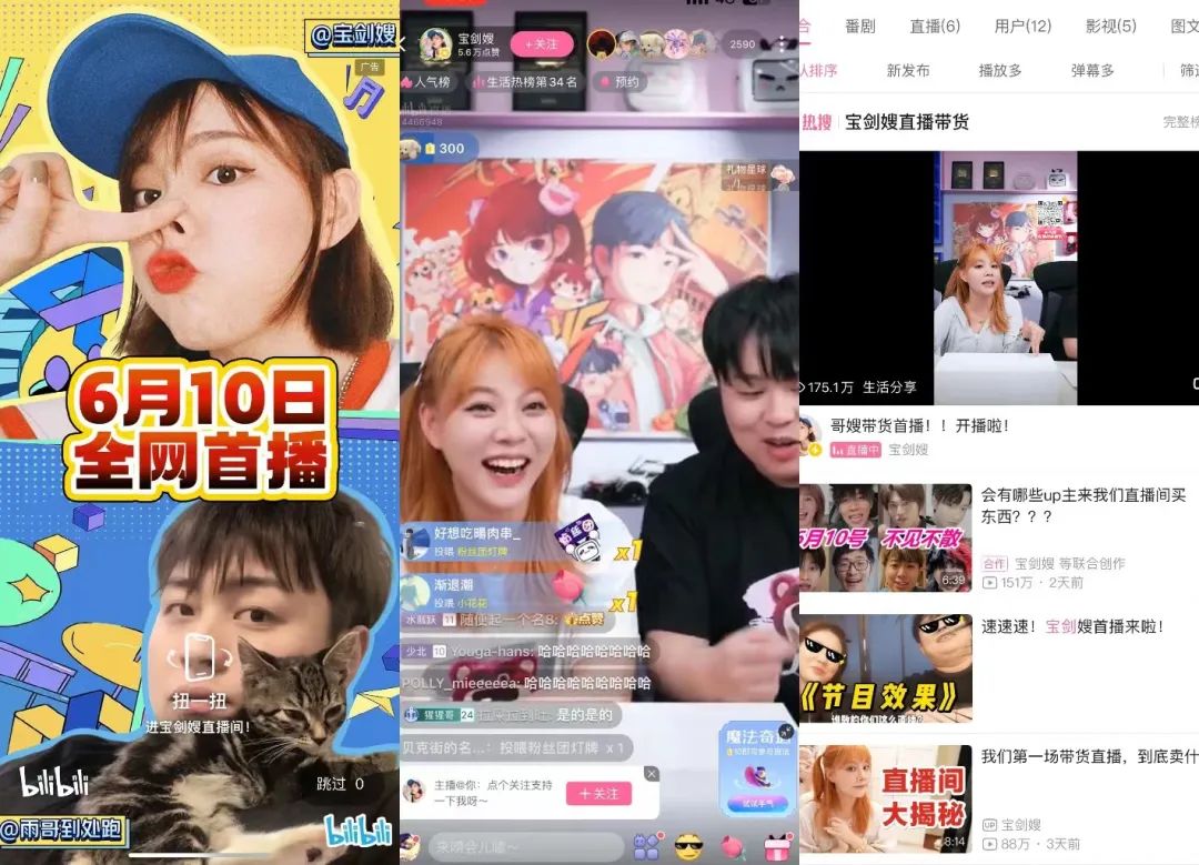 UP主们也在“恰饭”这条路上走得更远。继单场带货上亿元的家居UP主“Mr迷瞪”之后,2023年更多头部创作者试水直播带货,“宝剑嫂”“鹦鹉梨”等均卖出了单场GMV数千万的成绩。