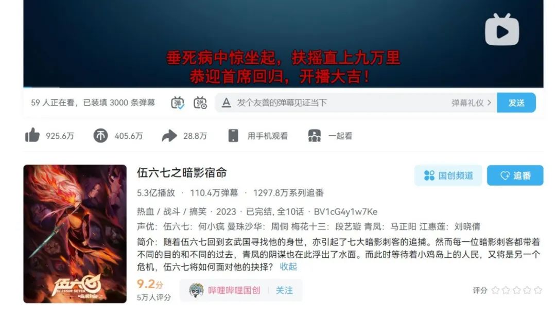 据新站数据不完全统计,2023年发布于B站的视频中,播放量排名前10的有5条是国创内容,其中包含《中国奇谭》和《伍六七之暗影宿命》这两部作品。