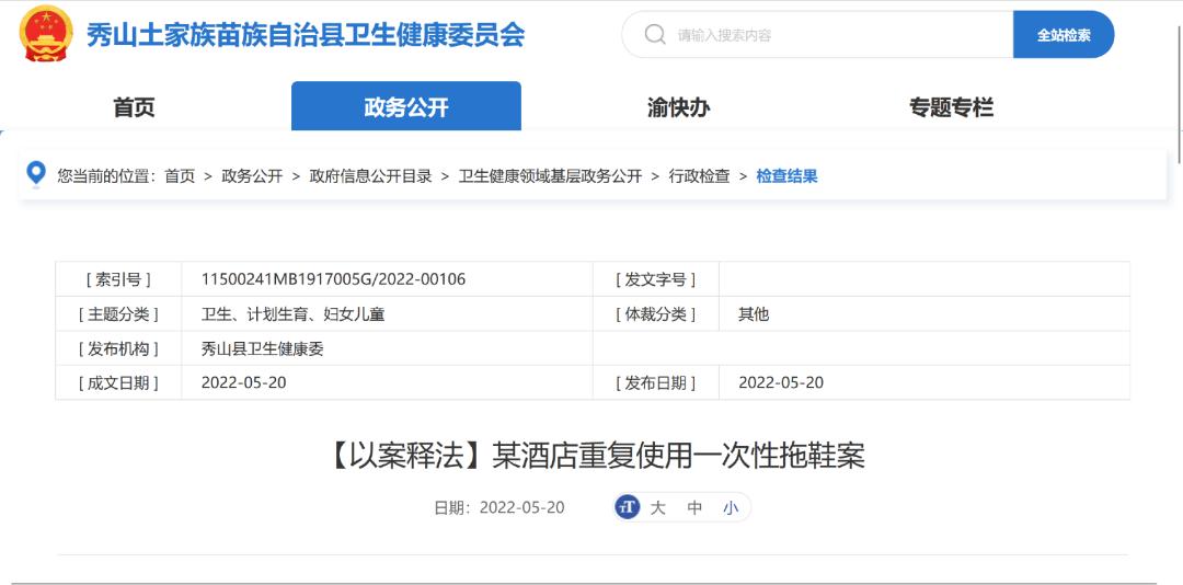 秀山县卫生健康委发布对该酒店行政处罚通知 来源 | 秀山县卫生健康委