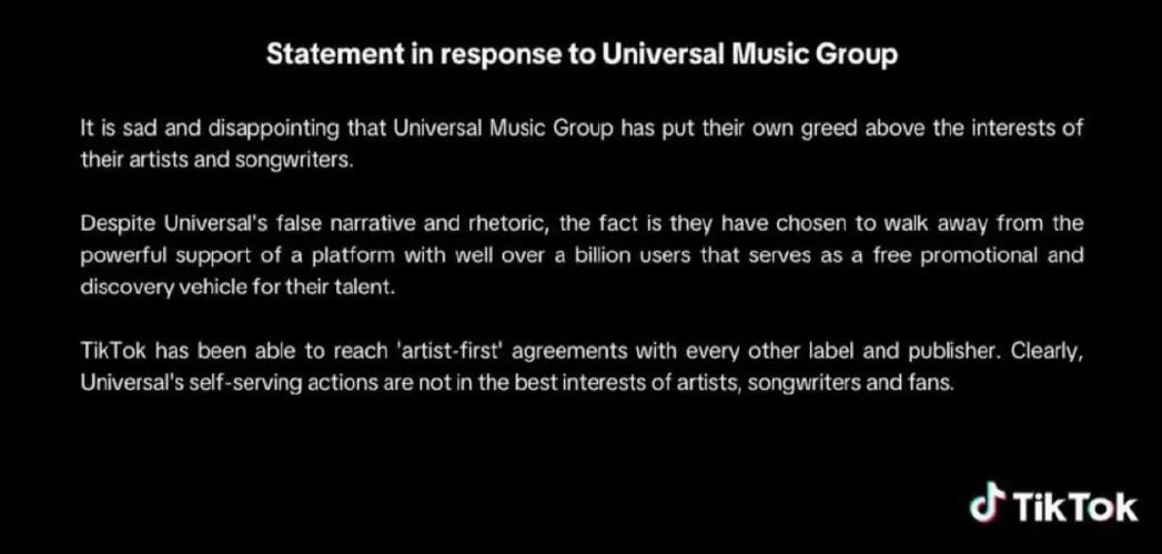 但TikTok对此并不接受。在声明中指责环球音乐“将自己的贪婪凌驾于艺人和词曲作者之上,令人悲哀与失望”,并称TikTok已经与所有其他唱片公司和出版商达成了“艺术家优先”的协议,环球音乐的自私行为不符合艺术家、词曲作者和粉丝的最大利益。
