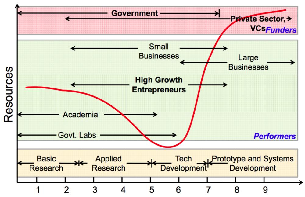 这些风险的关系不是“相加”,而是“相乘”,且共同构成了科技成果转化的“死亡之谷”——科技成果从实验室到商业化应用。