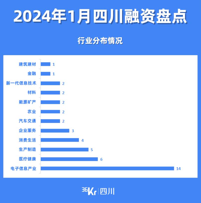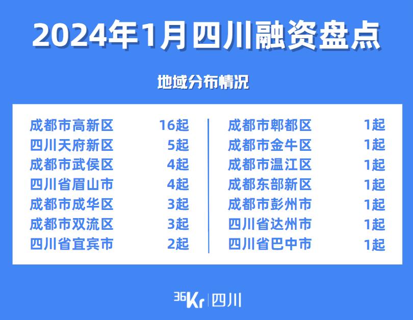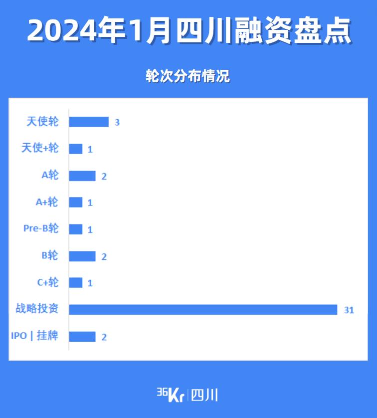 2024年1月,36Kr四川通过公开渠道,共收录与四川相关的融资、上市等事件44起,涉及相关企业44家。