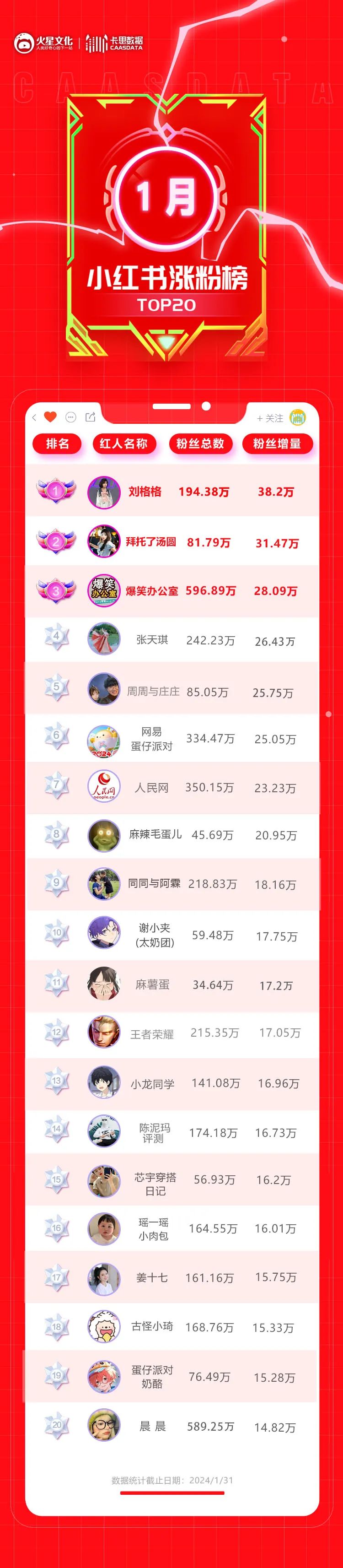 2024年开年之际,小红书内容生态呈现出了怎样的面貌?让我们一起在春节到来之前,围观下新鲜出炉的一月涨粉榜: