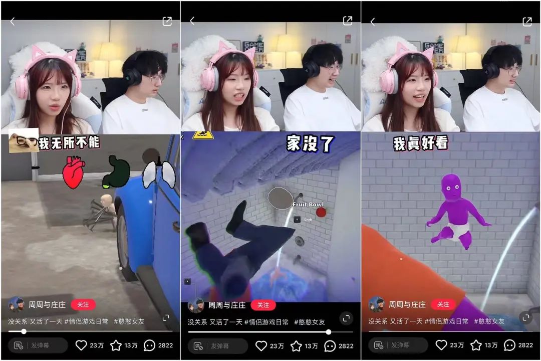 其二则是在于,庄庄经常在一些自由度高的游戏中进行脑洞大开的操作,与此同时还嘟嘟囔囔,不时制造一些蠢萌发言。面对女友的犯蠢行为,周周时长忍不住吐槽,两人一唱一和,一个卖傻一个吐槽,颇有些漫才喜剧的意味。