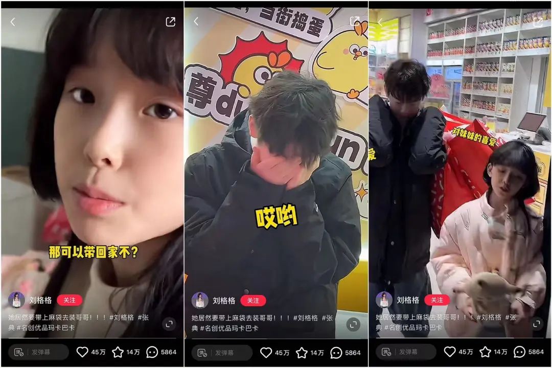 今年初,格格妈妈又兑现诺言,带格格去了郑州张典家玩。不同的是,这次格格从发型到服饰都cos了另一位小博主臻臻,变成“男孩模样”。看到自己心心念念的“甜妹”变成“酷弟”,张典有些不能接受,常常对着格格的头发哭诉,希望她能改回水母头,这副“破防”的样子给粉丝们送上了不少笑料。