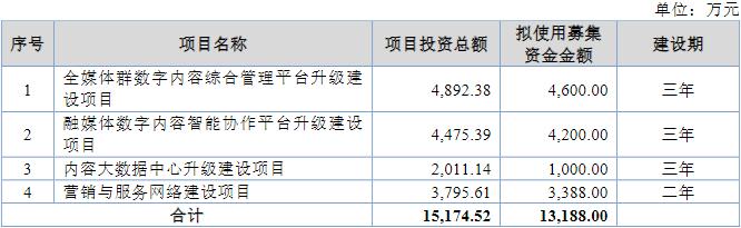 本次IPO拟募资1.32亿元,用于全媒体群数字内容综合管理平台升级建设项目、融媒体数字内容智能协作平台升级建设项目、内容大数据中心升级建设项目和营销与服务网络建设项目。