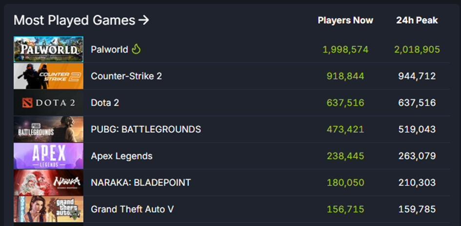 在Steam上,《幻兽帕鲁》销量瞬间登顶,同时在线人数一度高达200万,是第二名《CS Go》的两倍。