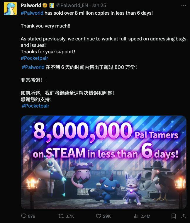 《幻兽帕鲁》不光是火,卷钱能力更是一流。
