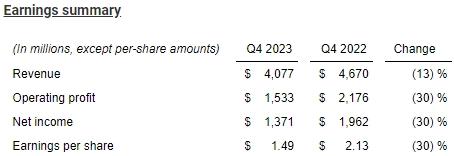 据财报披露,德州仪器2023财年第四季度营收为40.8亿美元,环比下降10%,同比下降13%;净利润为13.7亿美元,同比下滑30%,均低于分析师预期。