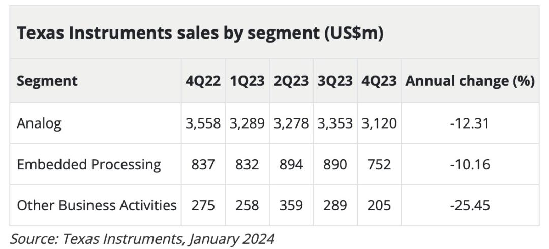 在最新的2023年四季度财报当中能看到,德州仪器与汽车相关的嵌入式处理业务营收出现了10%的同比下滑。