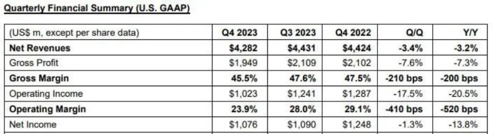 23Q4季度,意法半导体总营收42.8亿美元,同比下降3.2%。