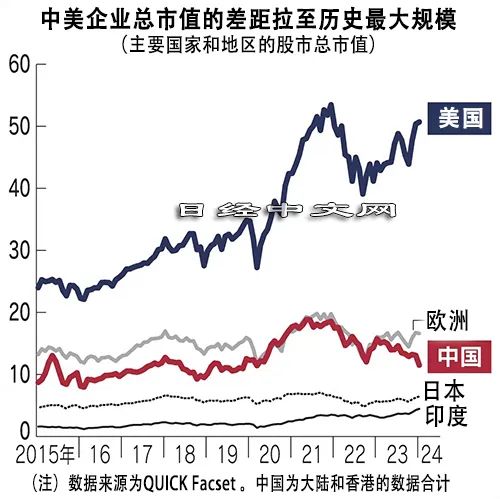 日经汇总了全球企业按美元计算的总市值。美国企业为51万亿美元,在全球整体总市值中的占比达到48.1%,创出了约20年来的最高水平。中国占全球总市值的份额2015年6月曾一度上升至近2成,目前降至10%左右。资金还在流向日本和印度……