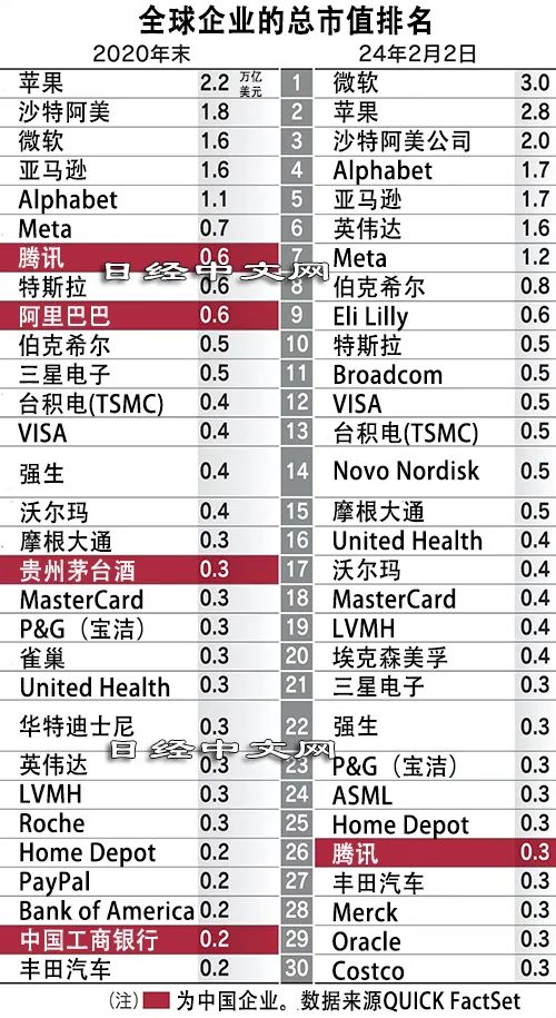 日本经济新闻(中文版:日经中文网)借助QUICK FactSet的数据汇总了全球企业按美元计算的总市值。美国企业的总市值为51万亿美元,比2023年底增加1.4万亿美元。截至2月2日,在全球整体总市值中的占比达到48.1%,同比上升1.6个百分点,创出2003年9月以来的新高。