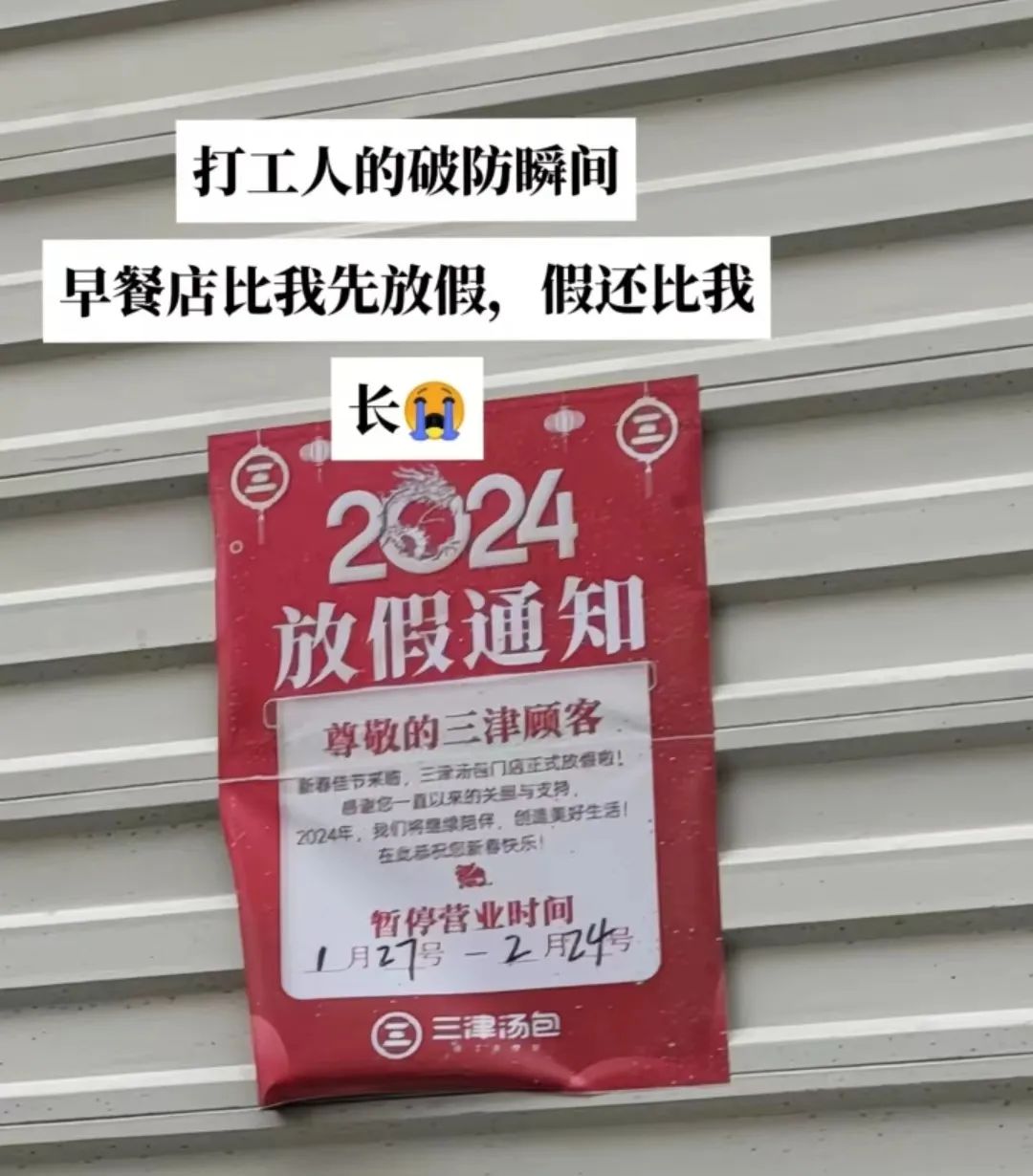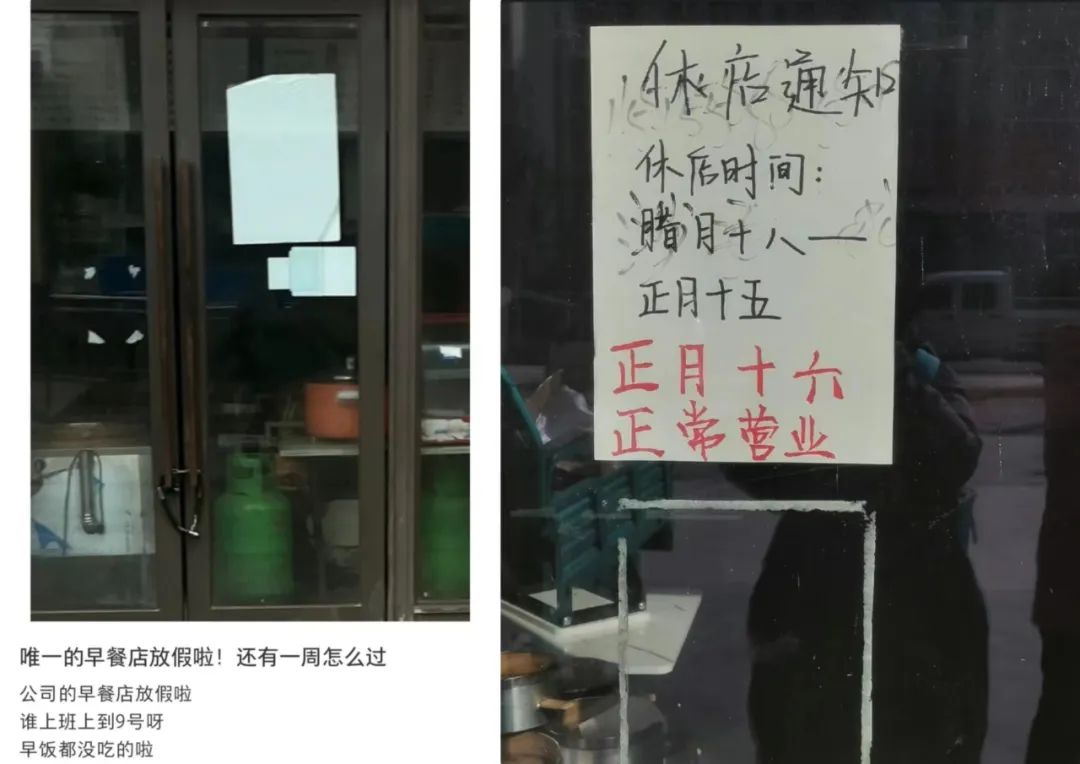 看到贴在早餐店门口的这些放假通知,一休息就是半个月一个月,打工人的心和胃都受到了冲击。