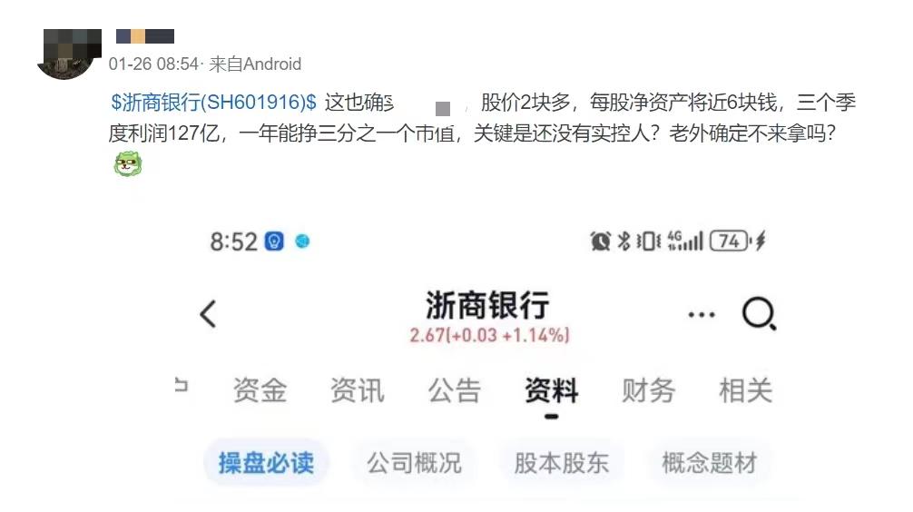 比如“股价2块多,每股净资产将近6块钱,三个季度利润127亿,一年能挣三分之一个市值,关键是还没有实控人?老外确定不来拿吗?”